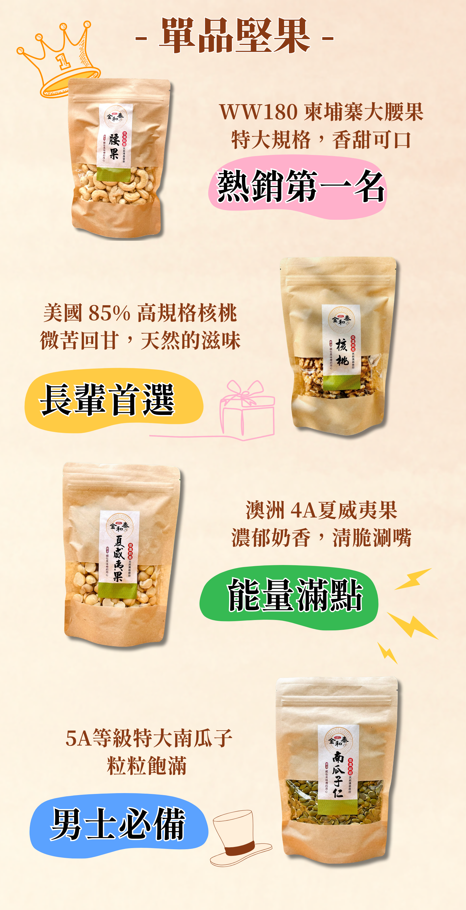 金和泰烘培利用專業堅果烘培設備低溫烤培,將營養完全保留。 每週少量製作,提供最新鮮的食材給顧客。