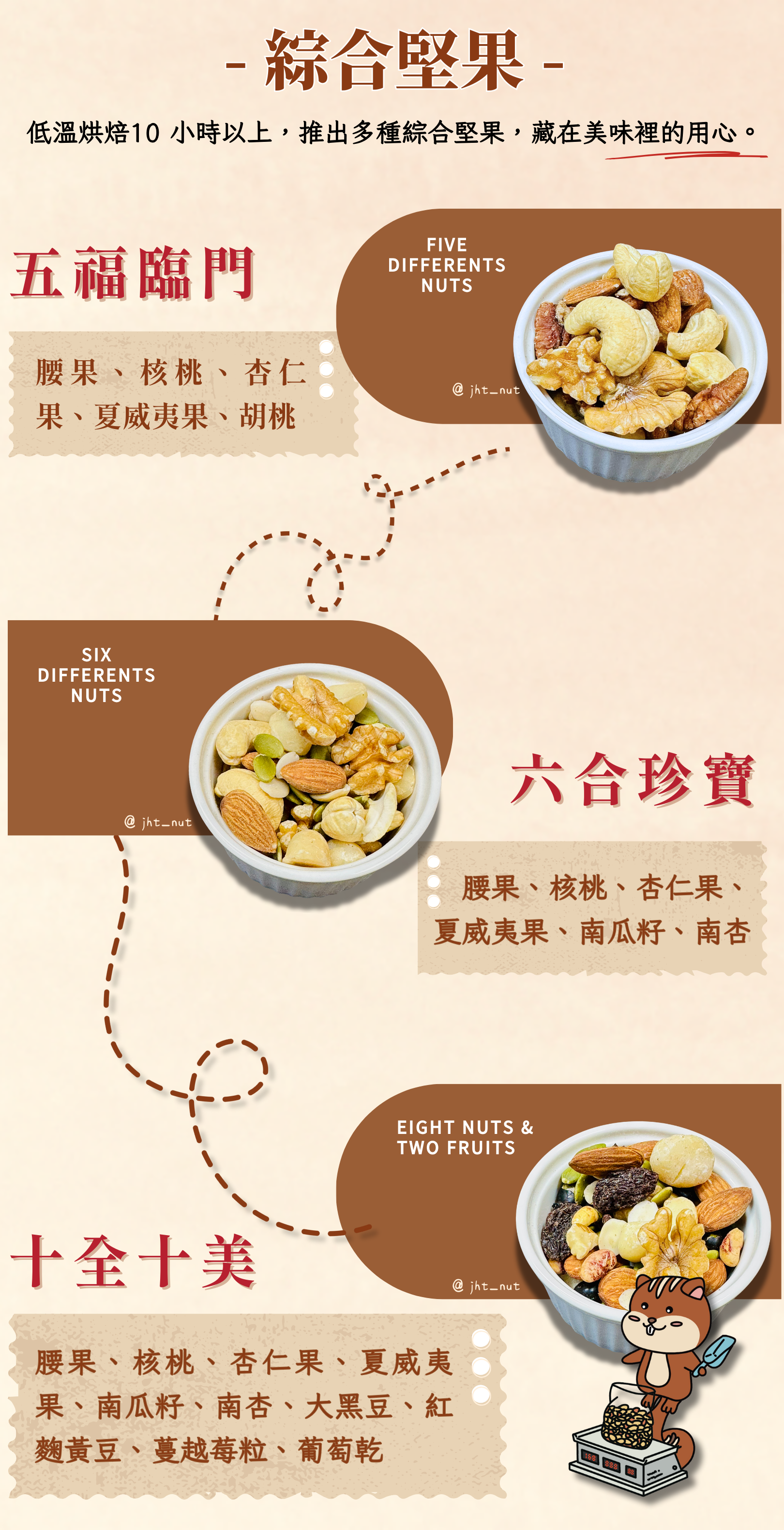 「低溫烘培六和珍寶」綜合堅果嚴選來自美國、柬埔寨、澳洲等地的高品質堅果,